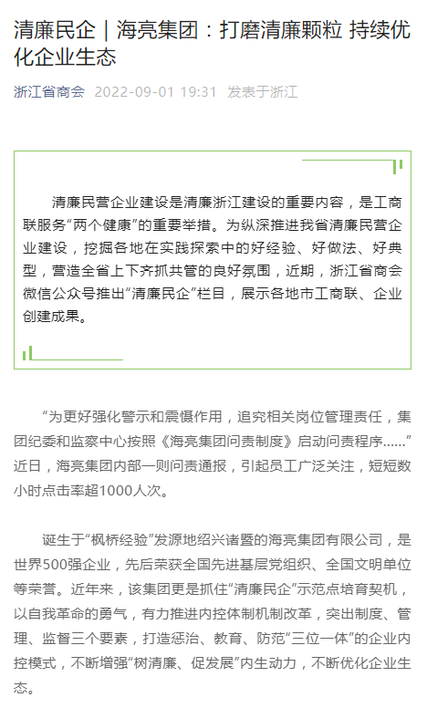 9月1日,浙江省商會“清廉民企”專欄以《海亮集團(tuán):打磨清廉顆粒 持續(xù)優(yōu)化企業(yè)生態(tài)》為題,報道海亮集團(tuán)企業(yè)清廉建設(shè)經(jīng)驗,世界浙商網(wǎng)等媒體平臺轉(zhuǎn)載。