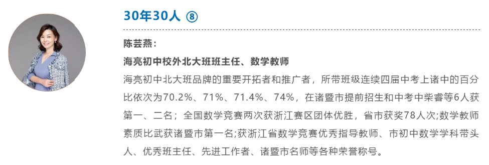進入海亮之前陳蕓燕老師曾在三都鎮中工作,在當地已小有名氣,獲得諸暨市第四屆教壇新秀、諸暨市初中數學學科帶頭人、優秀班主任、先進教師,諸暨市百節優質課等各種榮譽稱號,所帶三年的鄉鎮初中學生章東權同學在紹興市第一次獨立命題中考中獲得諸暨市第一名。